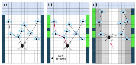 Instances of the tree expansion and execution using the guided sampling approach: (a) The tree is expanded from the current robot position in a uniform manner. (b) The samples have been evaluated, and the most informative trajectory is selected (marked in red). While the platform is moving within the environment, the tunnel walls are detected. (c) In an RH fashion, the robot moves to the first node of the best branch and samples again the search space. This time, a discrete probability distribution is applied. The weights of each discrete interval are computed based on the information gain of each sample falling in that interval.