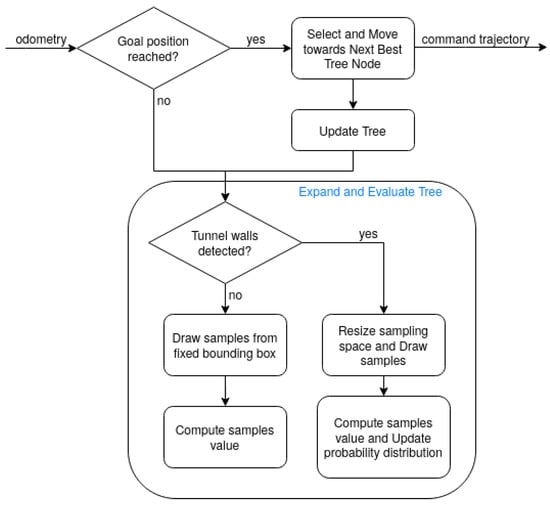 Figure 5 shows an overview of the planning algorithm. While the robot is moving towards the goal position, the RRT* tree is continuously expanded with new samples following the sampling procedure described in the previous paragraphs. The samples are evaluated as described in Equation (3), and their computed value is stored. Once the robot reaches its goal position, the trajectory towards the next-best tree node adjacent to the current robot position is commanded, and the tree is updated by changing its root to the new robot position. This process is repeated continuously until the inspection mission is stopped. This main planner loop takes 1 to execute on an Intel(R) Core(TM) i7-10610U CPU @ 1.80 GHz computer, from which 70% of the time is spent on expanding and evaluating the tree.