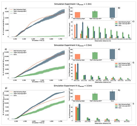 Simulation experiment results for the three different values of . For each simulation scenario: (a,d,g) number of voxels sensed along the inspection path for the three methods compared, (b,e,h) mean length and standard deviation of the inspection trajectory, (c,f,i) mean distance distribution of all the voxels observed during the inspection. These results correspond to 10 simulation runs for each experiment.