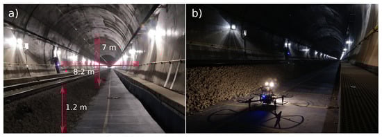 Focusing on tunnel-like infrastructures, the particularities of their grounds that are usually uneven, potentially wet and, as in the case of railway tunnels, contain tracks and other obstacles, limit the number of solutions that consider ground robots for the inspection task [,]. In contrast, the use of flying robots as an inspection tool is continuously increasing due to their capacity to easily traverse 3D space and quickly reach high and difficult to access areas [,,,,].
