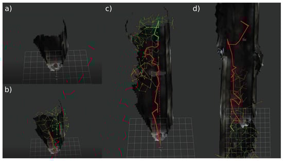 To start the autonomous inspection mission, the robot is given a goal point located from the take-off location. Once the goal is reached, the drone is commanded to return to the initial take-off point. Along the entire forward and backward trajectory, the objective is to maximize the tunnel surface inspected by the on-board sensors. Figure 10 shows several instances of such an autonomous inspection procedure. Figure 10a depicts the moment at which the drone is taking off, and the tunnel map representation is created in real-time by the on-board computer. Next, the nearby environment is sampled, and viewpoint locations are added to the RRT* tree, expanding it within the mapped environment. The next-best-view position is identified based on the value formulation presented in Section 3, and the robot is commanded to move to the next best location. The trajectory followed by the robot is marked in red (see Figure 10b). The higher informative gain of the samples located closer to the tunnel walls steers the platform’s trajectory towards that direction, as seen in Figure 10c. At this point, the tunnel wall direction has not been detected yet. As noticed, while flying towards the commanded goal closer to the right-hand side wall, the robot was unaware of the location of the opposite wall. The field of view of the equipped depth sensor was not sufficient to capture both walls of this wide tunnel environment. Once the platform follows a trajectory closer to the center of the tunnel, the presence of the opposite wall is detected. When the goal is reached, the platform returns to the take-off location while inspecting the other side of the tunnel (see Figure 10d). As the information gain obtained by inspecting the same wall decreases, a higher number of samples are taken closer to the recently discovered surface.