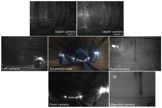 Example of images captured by all the inspection payload sensors together with a 3rd-person view of the aerial platform flying inside the railway tunnel.