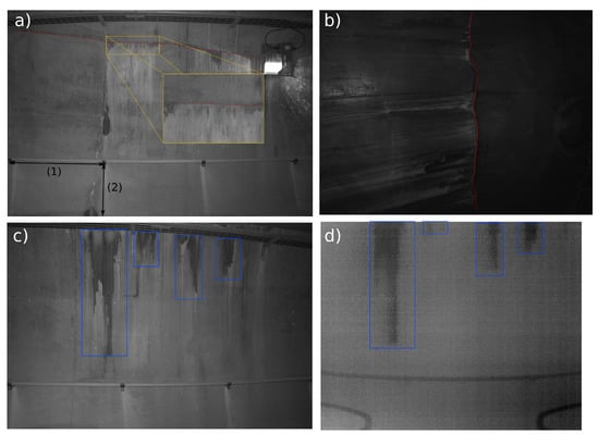 Regarding the effect of the on-board illumination system, it can be noticed how the tunnel wall images captured from a smaller distance present a constant illumination without being overexposed. Due to the height limitation imposed during the autonomous flight, the images corresponding to the tunnel ceiling are slightly underexposed due to the higher capturing distance. Nonetheless, defects, such as long cracks, can still be identified, as seen in Figure 13b. Figure 13c,d highlights several water inlet areas visible on both visual and thermal channels. Under these test conditions, no other temperature difference was noticeable on the captured thermal data.