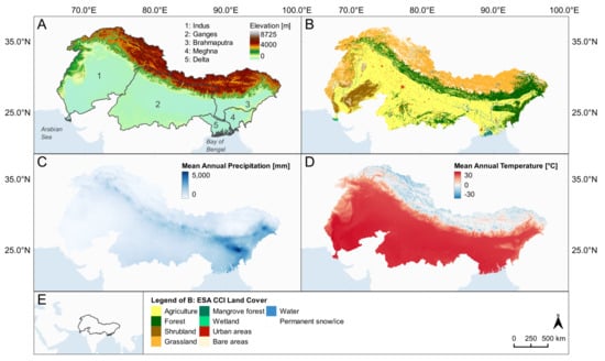 Characteristics of the study area showing (A) elevation [52] and outlines of the river basins extracted from the hydrographic information dataset HydroSHED [53], (B) reclassified European Space Agencies (ESA) Climate Change Initiative (CCI) land cover data, (C) mean annual precipitation based on Climate Hazards Group InfraRed Precipitation with Station data (CHIRPS) [54], (D) mean annual temperature based on TerraClimate [55], and (E) location of study area in South Asia.