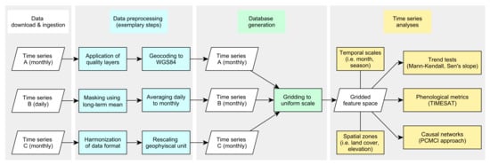 Our methodological framework focuses on the analysis of land surface dynamics by means of multivariate geospatial time series. First, the gathered time series data are introduced. Next, our approach to generate a unified feature space is presented and, lastly, the implemented statistical time series analysis techniques are described. At this point it has to be noted that all implemented processing steps ranging from preprocessing over database generation to statistical time series analyses can be run automatically with a global set of parameters. A brief summary of our implemented framework is presented in Figure 2.