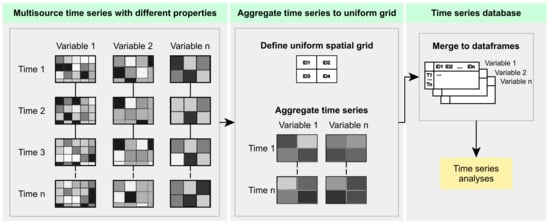 Since all time series come with different characteristics, the generation of a unified feature space in terms of spatial and temporal resolution is required, in order to enable joint analyses with multisource variables (Figure 3). In this study, the multivariate time series are unified by means of grid cells covering our study area at a spatial resolution of 0.1 (approximately 10 km). During this process, all time series are aggregated to the uniform grid at monthly temporal resolution. Spatial aggregation is performed by averaging pixels intersecting a given grid cell, weighted by the fraction of the pixel that is covered by the grid cell. Likewise, the spatial and temporal aggregation is applicable to any other geographical entity and temporal intervals, respectively. We implement our framework using R and Python programming language. In particular, we employ, i.e., the exact extract library (https://github.com/isciences/exactextract/; accessed on 10 November 2021) for spatial aggregation of all variables. The preprocessing and spatial aggregation of the geospatial time series is conducted on a high performance cluster using docker containers with minimum user interaction. The unified feature space is represented by dataframes, including the respective time series variables for each grid cell. These dataframes are used as input for the following time series analyses methods (Figure 3).