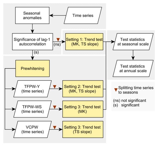 Furthermore, both statistical measures have no requirement for data distribution, but expect the time series to be serially independent. Approaches to account for serial correlation include aggregation of time series to annual scale or pre-whitening (PW). However, temporal aggregation to annual resolution reduces the number of data points and consequently yields smaller statistical significance [73]. Thus, to reduce seasonal influence and serial correlation, seasonal anomalies are derived by calculating the departure of the actual monthly observation from the long term mean of the respective month (Figure 5). Afterwards, we check the existence of lag-1 autocorrelation (). If is not significant, MK test and TS slope estimator are applied on the seasons of the anomalized time series. If is significant, the time series is pre-whitened to reduce autocorrelation. In general, PW removes the lag-1 autocorrelation from the time series. Depending on the selected PW approach, it can result in high or low type I error and biased slope estimates. Findings in literature indicate that trend-free pre-whitening after Yue et al. [74] (TFPW-Y) has a high test power and is the most frequently applied PW algorithm [73]. TFPW-Y blends the time series by removing coefficient from it. However, studies show that application of TFPW-Y might cause high type I error and an overestimated slope estimate [73,75]. In this regard, studies suggest not to rely on only one PW algorithm [75]. Hence, we additionally use the trend-free pre-whitening approach after Wang and Swail [76] (TFPW-WS) being characterized by a low type I error and high test power. TFPW-WS removes serial correlation in an iterative procedure while preserving the trend. Furthermore, to account for biased slope values through PW, Collaud Coen et al. [73] recommend to apply the TS slope estimator on a time series pre-whitened with a variance correction procedure (VCPW) after Wang et al. [75]. As depicted in Figure 4 we apply one setting including the TFPW-Y approach for both MK test and slope estimation and a further setting using TFPW-WS and VCPW to assess significance of trend and derive an unbiased slope estimate, respectively.