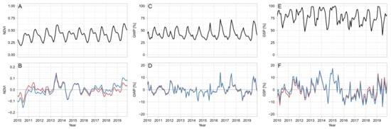 Diagram illustrating exemplary monthly time series of (A,B) MODIS NDVI, (C,D) DLR Global Waterpack (GWP), and (E,F) DLR Global Snowpack. The diagrams A, C, and E show the original time series, whereas B, D, and F the seasonally anomalized (blue line), as well as detrended anomalized (red line) time series. NDVI is extracted from a grid cell over the southern Ganges river basin, GWP from the confluence of the Ganges and Brahmaputra rivers, and GSP from the upper Ganges river basin.