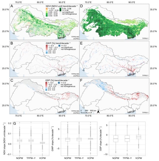 Trends based on seasonal MK test for NDVI, GWP, and GSP based on monthly observations from 2000 (GWP: 2003) to 2019. (A–C) Spatial distribution of trends derived with TFPW-WS (in combination with VCPW) and (D–F) TFPW-Y. The magnitude of trends is denoted at decadal scale. Only trends being significant and homogeneous over the seasons are colored. Trends not being homogeneous at annual scale are illustrated by a white colored box of a respective grid cell. (G) Magnitude of trends with respect to the different settings.