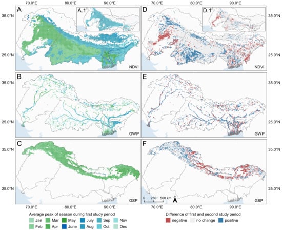 Average timing of the seasonal peak based on TIMESAT with (A–C) showing the mean seasonal peak between 2000 (GWP: 2003) and 2009 and (D–F) the difference between the mean peak of the first (2000–2009) and second (2010–2019) decade. NDVI is partially characterized by two annual seasons (A/D: values of first season together with areas characterized by one annual season, A.1/D.1: values of second season). Regarding (D–F), no change indicates a difference in average seasonal peaks of the two decades ranging between −0.25 and 0.25. A positive change indicates a forward shift in time of the seasonal peak in the second study period compared to the first and vice versa.