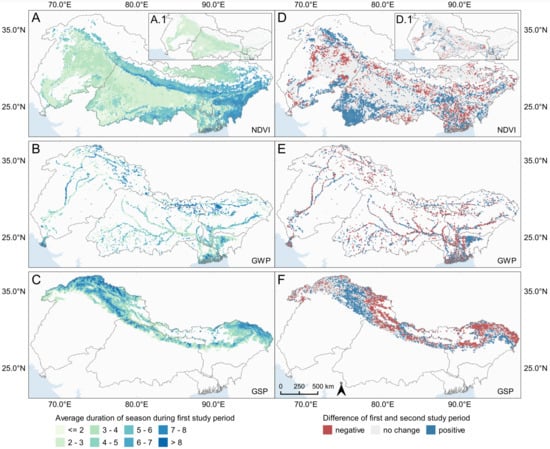 Average duration of season based on TIMESAT with (A–C) illustrating the mean duration of the season between 2000 (GWP: 2003) and 2009 and (D–F) the difference between the mean duration of the first (2000–2009) and second (2010–2019) decade. NDVI is partially characterized by two annual seasons (A.1/D.1: values of second season). Regarding (D–F), no change indicates a difference in average seasonal duration of the two decades ranging between −0.25 and 0.25. A positive difference indicates an increase in the seasonal duration in the second study period compared to the first and vice versa.