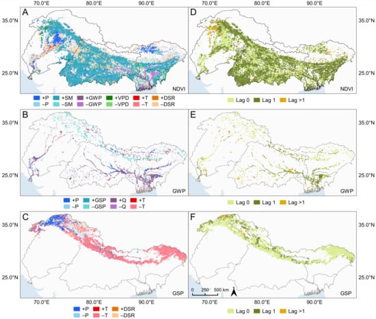 Spatial distribution of the dominant driving factors for NDVI, Global Waterpack (GWP), and Global Snowpack (GSP) (A–C) and their corresponding lags at monthly scale (D–F). The driving factors include precipitation (P), soil moisture (SM), temperature (T), radiation (DSR), vapor pressure deficit (VPD), discharge (Q), GWP, and GSP. The prefixes ‘+’ and ‘−’ of the driving factors indicate a positive and negative MCI measure, respectively. In this study, the MCI measure is based on the partial correlation coefficient. Gray colored grids in (A–C) indicate no causal link between targets and drivers.