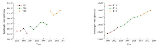 Cao’s research [,] was referred to for the processing of the DMSP nighttime light data, including noise removal and correction. The correction process included the desaturation and continuous correction of different sensors (F15, F16, and F18). Figure 3 shows the change in the total nighttime light value (TNLV) before and after the DMSP nighttime light data correction of the different sensors. The corrected DMSP nighttime light data have good continuity.