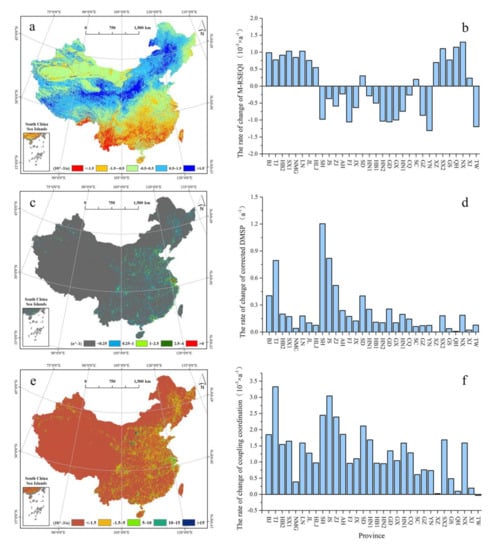 The change trend distribution of M-RSEQI (a), DMSP (c), and CCD (e) in China from 2000 to 2013 and the average trend value of M-RSEQI (b), DMSP (d), and CCD (f) for each province.
