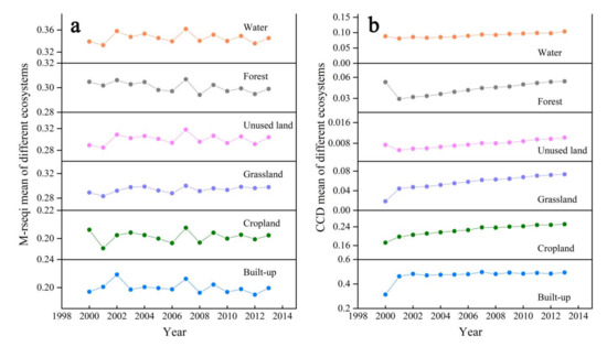 Figure 5b shows that built-up ecosystems (0.470) had the highest CCD among the six ecosystems. The CCD value of unused land (0.008) was the lowest. However, the CCD values of forest, grassland, and water that had higher EEQ levels were not higher, which indicates that the decisive factor of the CCD came from urbanization. This result is consistent with the conclusion in Section 4.3.1. In addition, the CCD values of the six ecosystems maintained a steady increasing trend from 2000 to 2013, which was closely related to the continuous development of urbanization in China during this period.