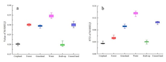 Figure 6a shows that the change in the M-RSEQI of the water ecosystem was the largest from 2000 to 2013, ranging from 0.333 to 0.362, which shows that the eco-environment of water in China greatly improved during this period. The M-RSEQI standard deviation for water was 0.135, which was the largest among all of the ecosystems (Figure 6, right). The interior of the water ecosystem is relatively complex and includes lakes, rivers, reservoirs, ponds, glaciers, and wetlands []. The standard deviations of the cropland and built-up areas were small, with values of 0.035 and 0.040, respectively, indicating that the EEQ was relatively stable.
