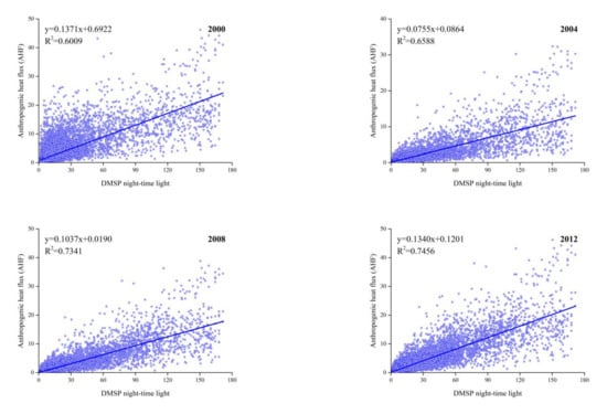 Corrected DMSP data were fitted with AHF [] (anthropogenic heat flux) data to explore the validity of the corrected DMSP nighttime light data in this article (Figure 7). From the four fitting equations, it can be seen that the light intensity was positively correlated with AHF, and that R2 was higher than 0.6, indicating a larger light intensity with a larger number of people, which was consistent with the actual situation. Therefore, the DMSP nighttime light data that were corrected in this study had high validity.