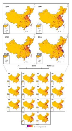 Spatial distribution map of corrected DMSP nighttime light data in China from 2000 to 2013.