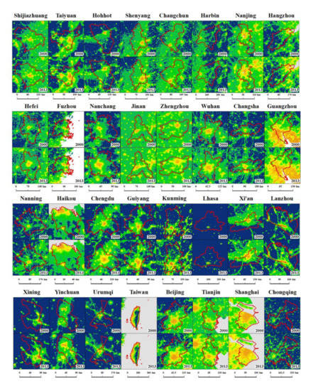 - Zhang, Q.; Seto, K.C. Mapping urbanization dynamics at regional and global scales using multi-temporal DMSP/OLS nighttime light data. Remote Sens. Environ. 2011, 115, 2320–2329. [Google Scholar] [CrossRef]
