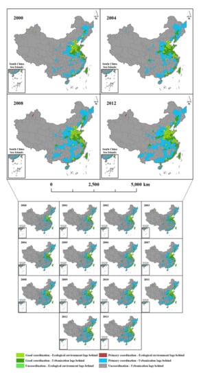 According to the grading standards in Table 2, the CCD of all of the cities in China from 2000 to 2013 were classified. Figure 11 shows that cities with higher CCD in China were mainly distributed in the North China Plain and in the southeastern coastal areas. From 2000 to 2013, most cities in China were in an uncoordinated state, which was concentrated in the central and western regions of China. In addition, there were almost no uncoordinated or primary coordinated cities with EEQ that lagged behind. This indicates that there was a large imbalance in the spatial distribution of urbanization development, which extended to most of China’s uncoordinated cities from 2000 to 2013.