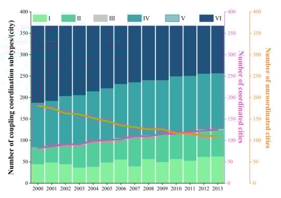 Figure 12 shows that the number of uncoordinated cities decreased each year, while the number of primary coordinated and coordinated cities increased. From 2000 to 2013, the number of coordinated cities increased from 83 to 125. Simultaneously, the number of uncoordinated cities decreased from 181 to 110. With the continuous development of China’s urbanization, the pace of urbanization gradually matched the EEQ, while the CCD also constantly improved. Since 2000, the number of Subtype VI (uncoordinated: urbanization lags behind) cities was the largest, whilst the number of Subtype IV (primary coordinated: urbanization lags behind) b cities became the largest in 2013. This shows that the level of urbanization in China was lower than the EEQ from 2000 to 2013. In summary, the coupling law of the EEQ and urbanization in China was “uncoordinated to primary coordinated. primary coordinated to coordinated, and with the characteristic of “urbanization lags behind EEQ” evolving into “EEQ lags behind urbanization”. In the future, the CCD of cities in China will go through the process of “Type III to Type Ⅱ to Type Ⅰ”. When the CCD between the EEQ and urbanization of most cities in China reaches Type Ⅰ, the entire CCD development process will be in a stable or circular development stage.
