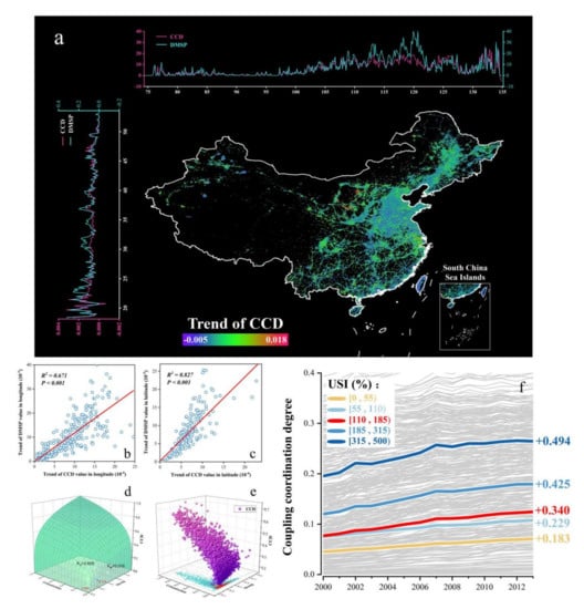 Urban areas are often used to evaluate a region’s level of urbanization [,]. Therefore, we extracted the land use and land cover (LULC) [] data for urban areas in China in 2001 and 2013, calculated the urban sprawl index (USI) of all cities in China, divided all of the cities into five categories according to the classification standard in Figure 13f, and finally counted the annual CCD values of these five types of cities and the 371 cities in China. It can be seen from Figure 13f that the CCD value of most cities showed a continuous upward trend (gray broken line). Most importantly, we found that the city with the highest USI had the highest CCD growth rate, reaching 0.494 (10−3/a). On the contrary, the city with the slowest USI had the lowest CCD growth rate, which was 0.183 (10−3/a). This also confirms the abovementioned speculation that urbanization has promoted the development of CCD.