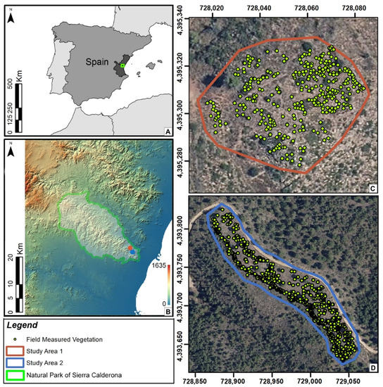Study area location in the central Mediterranean area of Spain (A). Digital elevation model of the Natural Park of Sierra Calderona with the two study areas (B); details of the study Area 1 (C), and 2 (D). The green dots represent vegetation points measured in the field. The reference system is EPSG:25830. Digital elevation model was obtained from ALS data, which, together with the orthoimages, were provided by the Spanish National Aerial Orthophotography Program (PNOA 2015 CC BY 4.0 www.scne.es (accessed on 11 December 2020).