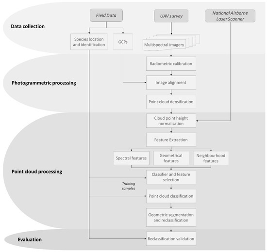 A general overview of the methodology is shown in Figure 2. Firstly, data collection was carried out from three different sources. Several multispectral flights were performed over the study areas and the positions of the Ground Control Points (GCPs) were collected by Global Navigation Satellite System (GNSS) and applying Real-Time Kinematic (RTK). This same technique was used to geolocate the position of the individuals studied; at the same time, the species of each individual were identified. ALS point clouds of the study area were obtained from the Spanish National Aerial Orthophotography Program (PNOA). In the second step we carried out the photogrammetric process to obtain the point clouds, where we performed a radiometric calibration of the multispectral images, aligned the images to reconstruct the flight scene, and densified the point cloud obtained during the alignment. In the next step we started the processing of the point clouds with the normalisation of the heights, where the bare ground points from the UAV-DAP and airborne laser scanning (ALS) point clouds were merged. Next, an extraction of spectral, geometric, and neighbourhood features from the point cloud was performed. Using the extracted features and training samples obtained from field data, a comparison of the following classifiers was performed: Decision Tree, Extra Trees, Gradient Boosting, Random Forest, and MultiLayer Perceptron. The method with the highest mean cross-validation scores was selected. Subsequently, a feature selection based on permutation feature importance and Pearson correlation was performed. Once the features were selected, the point cloud was classified using the selected classifier. In the last step of point cloud processing, we performed a segmentation of the point cloud based on its geometry, reclassifying it to regularise the classification. Finally, we validated the results obtained.