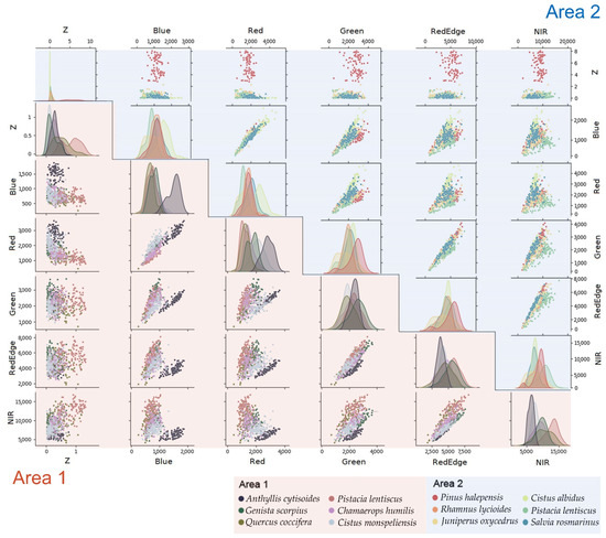 To carry out the point cloud classification by species, we performed a supervised classification of the point cloud, also known as point cloud semantic segmentation [57]. The training samples used to fit the models were extracted from field work data, where different geolocated individuals of each species were identified. A planimetric buffer of 15 cm was applied to these geolocated points, with this value being the minimum radius of the smallest individuals identified. The resulting polygon was used to clip the point cloud. After obtaining the samples for each class (Table 1), a process of manual filtering was conducted to avoid the introduction of outliers in the training samples. Figure 4 shows a representation of the training samples of each species based on some features extracted from the point cloud. This figure is a pairwise relationship plot of the dataset created from 100 random points of each of the species studied with their raw spectral bands and normalised height. It can be seen from the Kernel Density Estimator (KDE) located on the diagonals how in area 1 the species Anthyllis cytisoides differs from the others in the blue and red bands or how the species Pistacia lentiscus can be differentiated using only the normalised height information. This figure also shows the difficulty in distinguishing some species studied on the basis of these features. For example, in area 2 we found that the species Cistus albidus and Salvia rosmarinus have a similar spectral response and normalised height, making them difficult to differentiate. The relationships established in the upper and lower corners help to visualise the similarity or the difference between species. On the basis of its spectral features, the best distinguished species in area 1 was Anthyllis cytisoides, while the rest of the species were difficult to differentiate. In area 2, the normalised height was the feature that best distinguishes the Pinus halepensis species, while the spectral response of the different species was similar. In summary, Figure 4 shows that all studied species cannot be distinguished from each other on the basis of their raw spectral features and their height, making an in-depth analysis necessary.