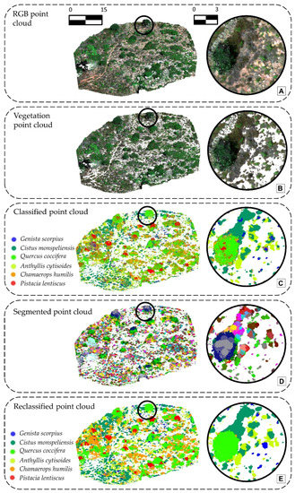 Detail of Area 1 workflow results. The results are ordered as follows: RGB point cloud obtained from the photogrammetric process (A); normalised point cloud showing the points classified as vegetation (B); classified point cloud of Genista scorpius, Cistus monspeliensis, Quercus coccifera, Anthyllis cytisoides, Chamaerops humilis, and Pistacia lentiscus species (C); segmented vegetation point cloud, representing each segment with random colours (D); reclassification of the point cloud based on the majority class of each segment (E).