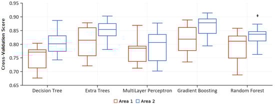 Table 5 shows the results of the different combinations of hyperparameters applied to the Gradient Boosting method. The combination of parameters that obtained the highest mCVs for Area 1 was the one formed by the minimum number of samples required to split an internal node of 3, minimum number of samples required to be at a leaf node of 2, and a maximum depth of the tree of 5, with a mean fit time of 255 s for each of the 10 iterations. On the other hand, the highest mCVs for the second area was obtained by the combination of a minimum number of samples required to split an internal node of 2, minimum number of samples required to be at a leaf node of 5, and a maximum depth of the tree of 10, with a mean fit time of 1317 s. Table 5 also shows how the hyperparameter with the greatest influence on the processing time was the maximum depth of the tree, multiplying up to 8 times the time by setting the value to “none”, compared to value “5”, without affecting the improvement of the model. If value is set to “none”, the nodes are expanded until all leaves are pure or until all leaves contain less than the minimum number of samples to split an internal node, which explains the increase in processing time. In contrast, if we analyse the minimum number of samples at a leaf node, the best results were obtained mostly by setting this hyperparameter to “5”.