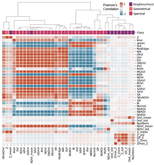 Pearson’s correlation cluster map of the Area 1 features derived from UAV-DAP data. The heatmap shows the correlation between the features studied. The class indicates the type of feature (geometric, spectral, or obtained by neighbourhood analysis). The trees show how the features are clustered according to their correlation.
