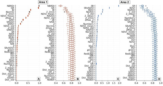Analysing the permutation importance of the features when applying the model (Figure 8A,C), among the top 10 features with the highest permutation importance for the model, three were repeated in the two study areas. These features were one of spectral type, BI, and two extracted from the neighbourhood analysis, Z_Zmin and Zmax_Z. In this sense, we can also observe how, depending on the area, the features with greater importance diverged. In Area 1 the most important feature was the NBRDI index, but in Area 2 this feature was the second to last in order of importance. Since each area has different tree and shrub species, with only one species in common, the common features with high importance values in both areas could be considered as adequate descriptors to differentiate the Mediterranean flora.