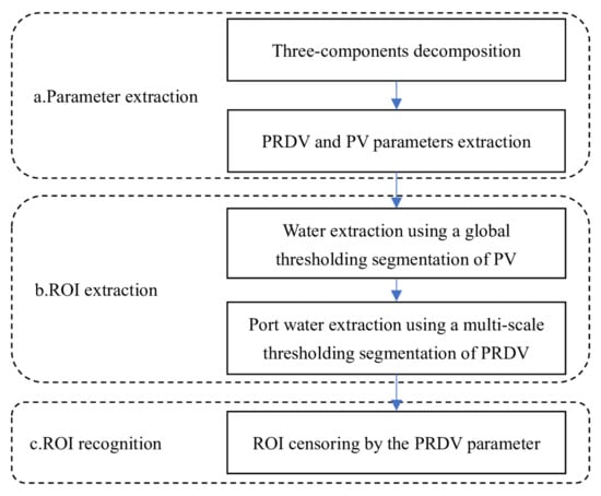 The flowchart of the proposed method is shown in Figure 2. In the step of parameter extraction, the polarimetric parameters of double-bounce and volume scattering power are first extracted using the modified three-component decomposition introduced in Section 2. The power of volume scattering (PV) and the proposed power ratio of the double-bounce scattering power to the volume scattering power (PRDV) are then computed using the double-bounce and volume power. In the step of ROI extraction, the ROIs of ports are extracted by recognizing port water using the proposed polarimetric parameters. Water regions are separated from the land by a thresholding segmentation of the PV parameter first. The suspicious port water pixels are then separated from other water pixels by a thresholding segmentation of the PRDV parameter using the multi-scale thresholding segmentation method. The candidate port water regions are detected by determining all connected regions with a large area from the extracted suspicious port water pixels to obtain the ROIs of ports. Finally, the candidate ROIs are censored by extracting the strong double-bounce scattering region using the PRDV parameter. Ports are detected by examining the area ratio of the strong scattering region to the land in the extracted ROI.