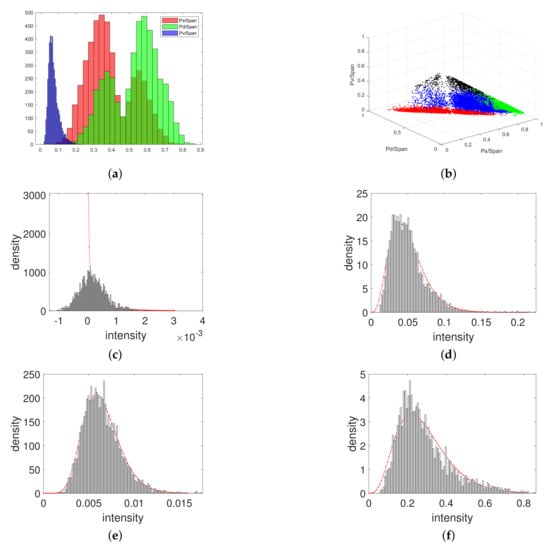 The histograms of the double-bounce and the volume scattering powers of different sampled water and land regions where the distributions are fitting using a gamma distribution shown with a red line: (a) The histograms of normalized power , , and of the port water; (b) the scattering distribution of , , and components of the sampled water and land regions; (c) the double-bounce power of a normal water area; (d) the double-bounce power of an interference water area; (e) the volume power of an interference water area; (f) the volume power of a land area.