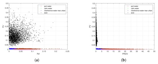 where denotes the double-bounce scattering power, and denotes the volume scattering power. Because the volume scattering power of the interference water region is lower than that of the interference land region, the PRDV parameter of the two kinds of regions is separable.