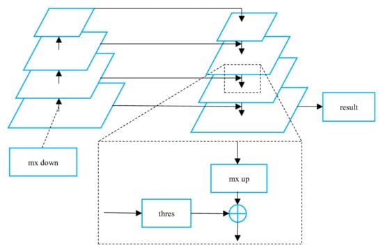 The multi-scale thresholding segmentation for the extraction of the interference water, where ‘thres’ denotes the thresholding process, ‘mx down’ denotes m times downsampling, and ‘mx up’ denotes m times upsampling.