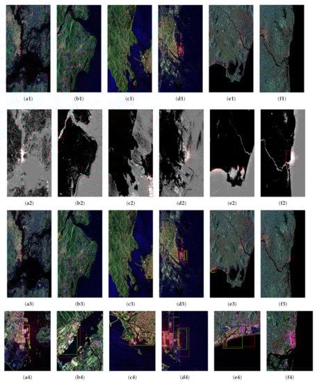 Detection results in different coastal scenes: (a1–f1) The Pauli pseudocolor image of Zhanjiang, Fujian, Tianjin, Lingshui, and Boao in China and Berkeley in America; (a2–f2) the ROI etection result, where the extracted water pixels are drawn in gray, the detected interference water pixels are drawn in white, and the extracted ROI is marked in red boxes; (a3–f3) the ROI recognition dresult, where the detected port is marked in a red box and the ground truth is marked in a green box; (a4–f4) the zooming recognition result near the target port; (a1–a4) Zhanjiang; (b1–b4) Fujian; (c1–c4) Berkeley; (d1–d4) Tianjin; (e1–e4) Lingshui; (f1–f4) Boao.