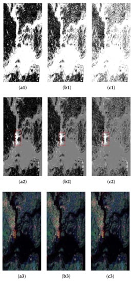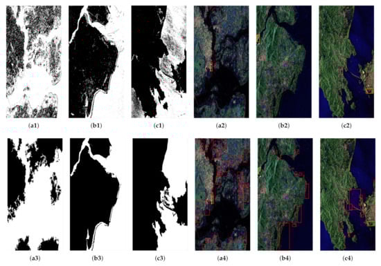Comparison of the proposed method under different PV thresholds in the Zhanjiang data: (a1–a3) C is set to 5 dB; (b1–b3) C is set to 7 dB; (c1–c3) C is set to 9 dB; (a1–c1) the water and land segmentation results; (a2–c2) the ROI extraction results; (a3–c3) the ROI recognition results.