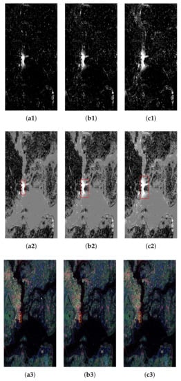 In the deorientation process, the polarization orientation angle (POA) is firstly estimated by Lee’s method [] or the method in []. The coherency matrix is then rotated by the POA. If the estimated POA is , then the deorientation coherency matrix is