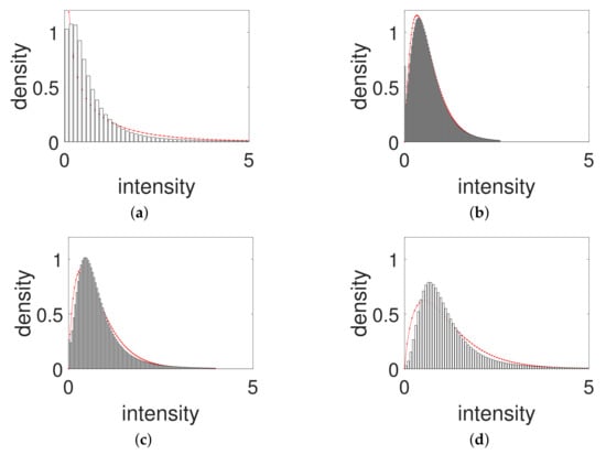 The distribution fitting results of the ratio parameter in different scenes, where the fitted gamma distributions are drawn with a red line: (a) Zhanjiang; (b) Fujian; (c) Berkeley; (d) Tianjin.