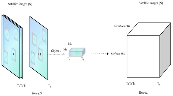 Considering imagery time-series, a fixed classical object/variable scenario, i.e., an agricultural field, can be observed several times under different conditions, yielding a separate data table for each condition [16]. Another option would be to pool all the object/variable conditions together taking into account the time-series of images, which leads to a consideration of a cubic or a three-dimensional data array as shown in Figure 1. Such an array has N images containing the corresponding objects (O) at Tn different dates, with each image being constituted of Mm spectral bands or wavelengths (variables). Given the data dimensionality, multiway arrays have been proven to be a natural and efficient representation of the data, in particular, tensor subspace learning methods have been shown to outperform their corresponding vector subspace methods, especially for small sample size problems [24]. Therefore, the N-PLS algorithm should constitute a relevant approach to retrieve the information contained in the spectral bands of satellite imagery to highlight the target phenomenon taking into account its effect on the temporal evolution of the imagery.