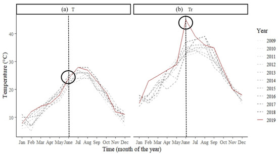 Mean monthly temperature (a) and maximum monthly temperatures records (b) from 2009 to 2019 across the Languedoc-Roussillon region, France, highlighting a peak in the maximum monthly temperature corresponding to the extreme weather event that occurred in June 2019, while the mean monthly temperature for this month was not extreme. The vertical black dashed line highlights the month of the heat wave. Source: Historique Météo-France.