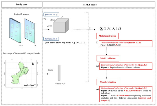 Among the alternatives proposed in the literature for modelling multi-way data, deep learning has the potential to outperform traditional classification and regression techniques [18]. However, deep-learning approaches often requires a large dataset to perform the learning and do not provide immediate access to intermediate steps to analyse and understand the agronomic processes that impact production. An interesting alternative to modelling multiway data has been proposed in the chemometrics literature, the multiway partial least squares regression (N-PLS). This is a modelling strategy introduced by Bro [17] and further advanced by Smilde [19]. N-PLS aims at building a model between a high-order array X of independent variables and a response array y [20]. In this paper, PLS regression is extended to multiway data (N-PLS), with the main emphasis on three-way data, by including time as a dimension. It is important to note that N-PLS imposes a trilinear structure on the data [21] and when introducing time into the analysis, this implies that the emphasis is exclusively on the development of a correlational structure over time [22], i.e., time will determine both the variability between individuals and the variability between variables (wavelengths). The N-PLS methodology allows a joint evaluation of time and variables, in order to determine the interaction between them, to know if and how the variables modify their “behaviour” at different occasions. To the authors’ knowledge, such an approach has not been proposed in the analysis of remotely sensed satellite imagery.
