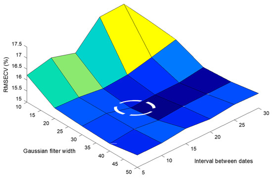Figure 8 shows the evolution of the RMSECV for a cross-validation of 2 blocks repeated 5 times with a N-PLS performed with the X cube and the y losses from the calibration set when varying the Gaussian filter width (P) and interval between dates (N). This procedure led to an observation of the lowest error of cross-validation (RMSECV) at P = 30 and N = 15. N = 15 equates to J = 7, i.e., 7 dates over the study period, and resulted in a cube X of dimensions (107, 7, 12). Figure 8 highlights three situations in which the cross-validation error (RMSECV) increased when applied to these data, as follows: (i) when the Gaussian filter is too weak (P > 25); (ii) when the time step is short (N < 10 days); (iii) when the time step is long (N > 20 days).
