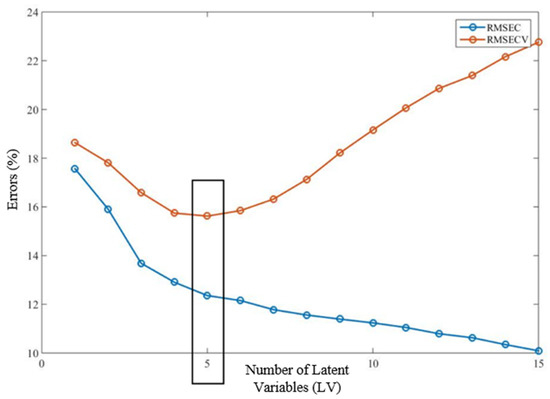 The calibration and validation subsets were generated using the method outlined in Section 2.3.2. The joint analysis of RMSEC (calibration set) and RMSECV (cross-validation) as proposed by Goodarzi et al. [30] was used to determine the optimal number of latent variables in the regression model.