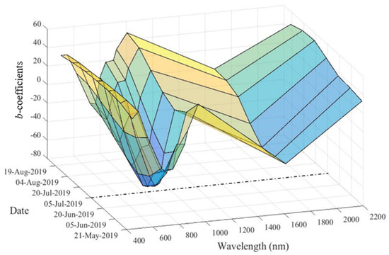 Figure 11 shows the spectral profiles for each spectral band (Figure 11a) and the temporal profiles by date (Figure 11b) of the b-coefficients. Regarding the spectral profile (Figure 11a), the spectral bands were clearly organized into the following three groups: (i) bands B1 and B2 (442.7 and 492.4 nm), which presented no variations throughout the study period, (ii) bands B3, B9 and B12 (559.8, 945.1 and 2202.4 nm), which showed a slight decrease by the end of June and, (iii) the remaining bands B4, B5, B6, B7, B8, B8A and B11 (663.5, 704.1, 740.5, 782.8, 832.8, 864.1 and 1613.1 nm), which presented a very pronounced V-shaped profile with a minimum b-coefficient observed on the 20th of June, identifying these spectral bands as significant in order to identify and characterize the heat stress.