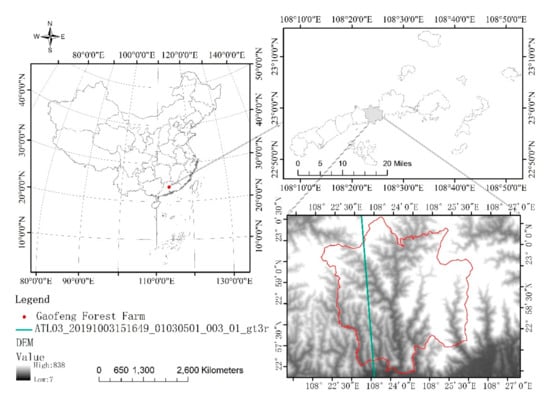 The study area is located in Nanning City, Guangxi Zhuang Autonomous Region, China, and it has a latitude and longitude range of (22.57°N~23.00°N, 108.23°E~108.24°E), as shown in Figure 1. Nanning, located in the southwest of Guangxi Zhuang Autonomous Region, has a subtropical monsoon climate, with an average annual rainfall of 1241~1753 mm, and an annual average temperature of almost 21.6 °C []. The study area is located at the hilly land. The slope of the terrain ranges between 10° and 48°, the area with a slope greater than 15° accounts for 62.21%. The altitude range of the study area is 120~360 m above mean sea level (World Geodetic System 1984, WGS84). The study area is dominated by forest land and unforested land. The existing main tree species are Eucalyptus urohpylla S.T. Blake, Eucalyptus grandis x urohpylla, Pinus massoniana Lamb., Pinus elliottii, Illicium verum Hook.f., Castanopsis hystrix Miq., Michelia macclurei Dandy, Mytilaria laosensis Lec., Acacia crassicarpa Benth., etc. The forest coverage rate exceeds 90%, while the canopy height ranges between 0.1 m and 24.6 m.