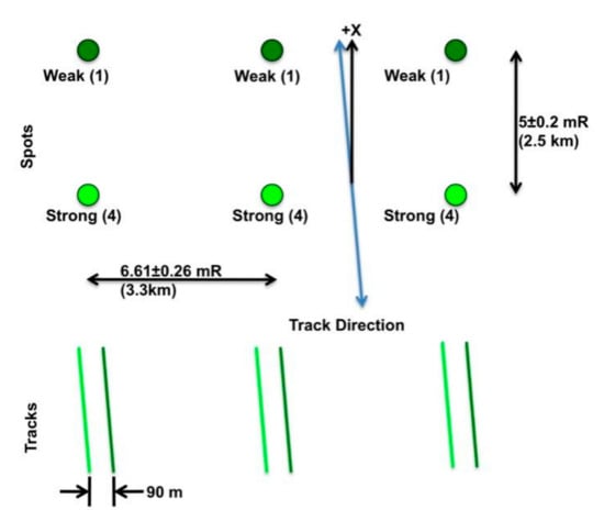 In September 2018, the National Aeronautics and Space Administration (NASA) launched a new type of space-based laser altimetry mission referred to as Ice, Cloud, and Ground Elevation Satellite 2 (ICESat-2). The average orbital height of the spacecraft is 496 km (± 6 km), the geographic coordinates refer to the WGS84 ellipsoid, and the spatial coverage is between 88° N and 88° S [,]. In order to be consistent with the airborne lidar data, the height of the ATL03 data is subtracted from the geoid correction information recorded in the ATL03 data. The Advanced Terrain Laser Altimeter System (ATLAS) [] is the only instrument on ICESat-2. ATLAS generates 532 nm laser pulses at a frequency of 10 kHz, with a footprint of almost 14 m in diameter, and a footprint of 0.7 m along the track [,,]. It uses 3 pairs of 6 beams, where each group contains one strong signal and one weak signal, with an energy ratio of 4:1. The vertical track distance of each pair of beams is almost 3.3 km. For each pair of beams, the distance between the strong and weak beams in the vertical track direction is almost 90 m, while the distance along the track direction is almost 2.5 km []. The footprint distribution form of the ATLAS data is presented in Figure 2.