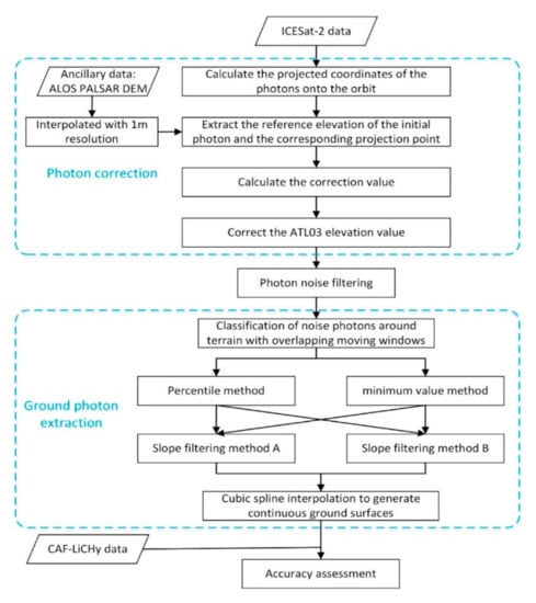 In this study, the ICESat-2 data processing steps included point cloud correction, noise elimination, ground surface extraction, and accuracy evaluation. These processes are prerequisites for obtaining accurate and reliable terrain data. An overview of the main steps of the proposed method is presented in Figure 3.